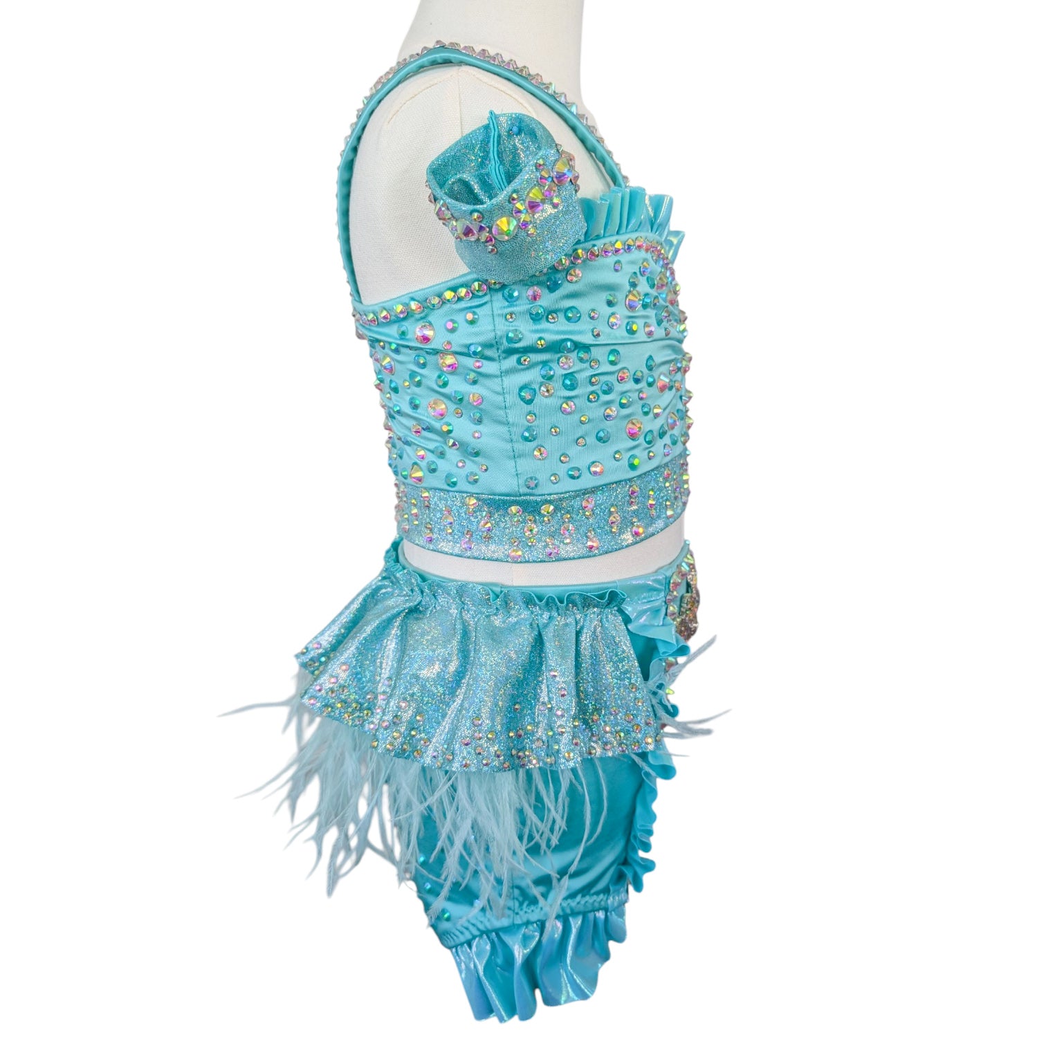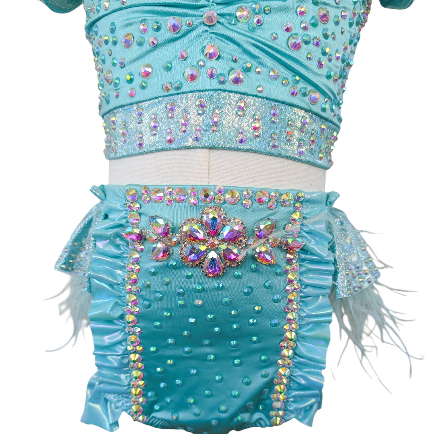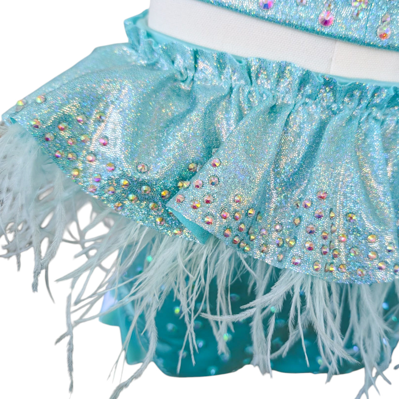 Sweetheart style top with double straps. High waisted bottoms with double layer ruffles and ostrich feathers. Comes with wrist cuffs. New with tags and fully stoned.