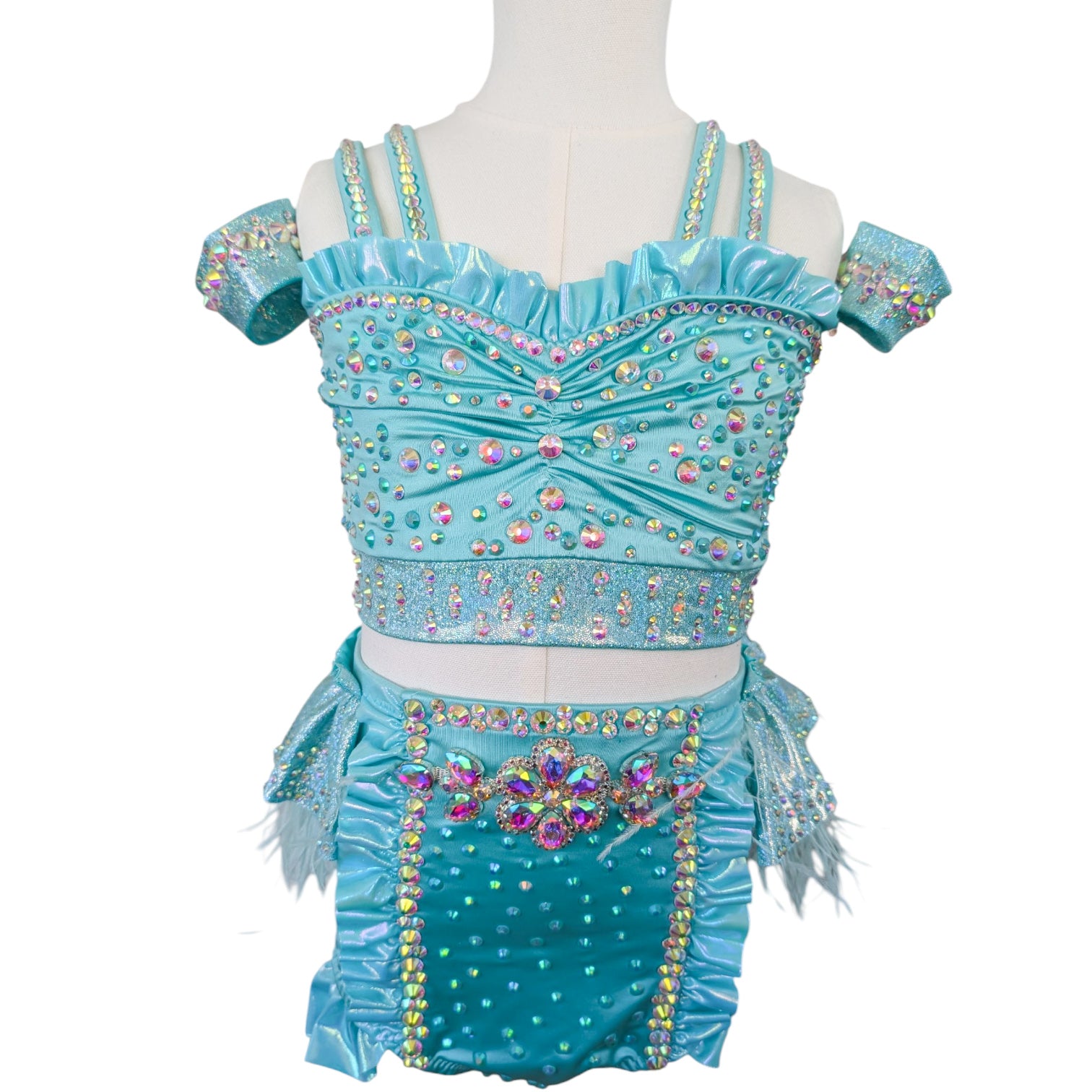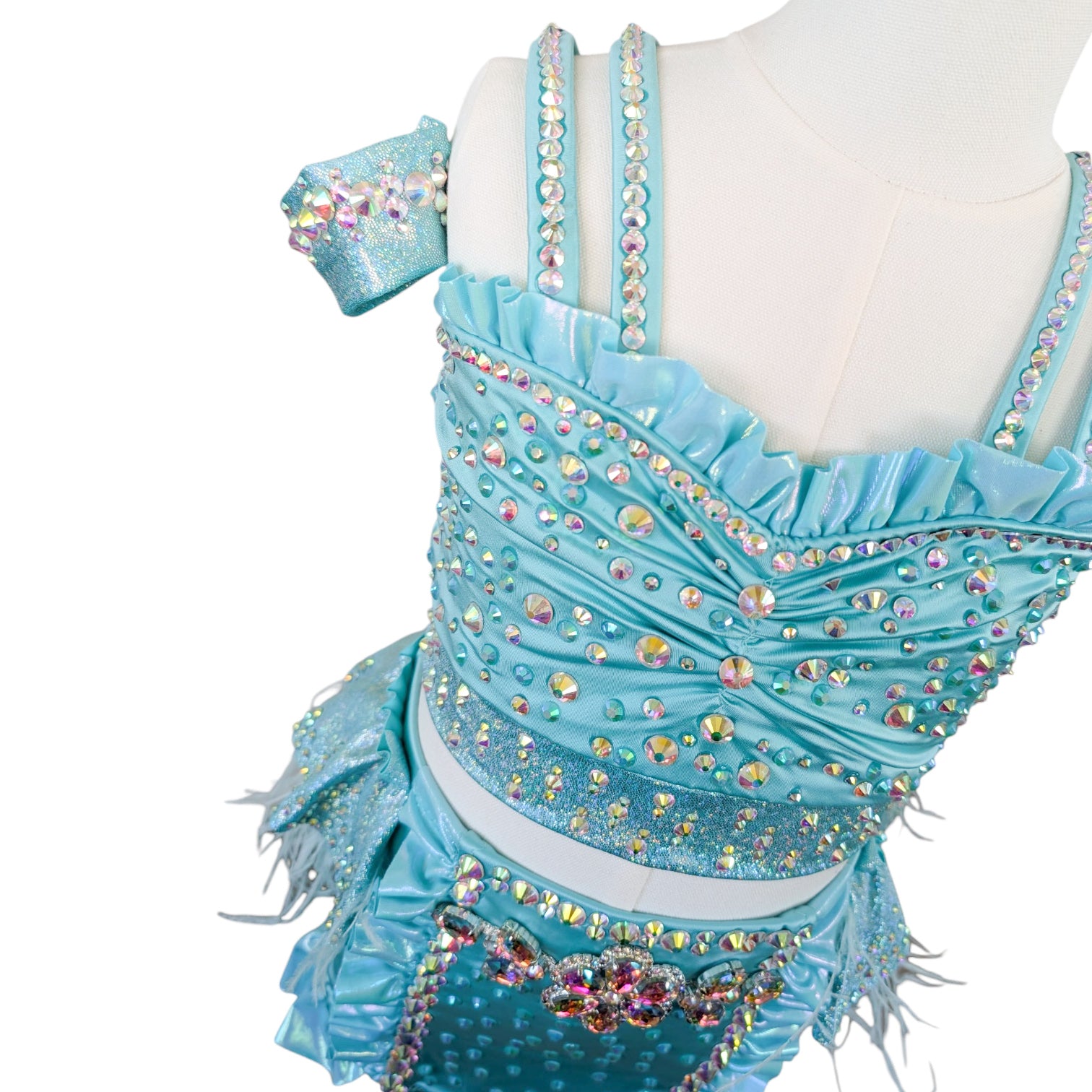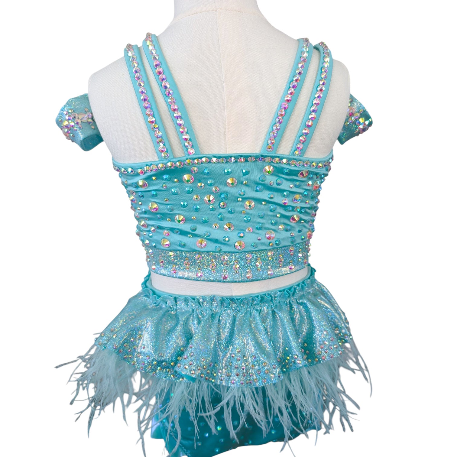 Sweetheart style top with double straps. High waisted bottoms with double layer ruffles and ostrich feathers. Comes with wrist cuffs. New with tags and fully stoned.
