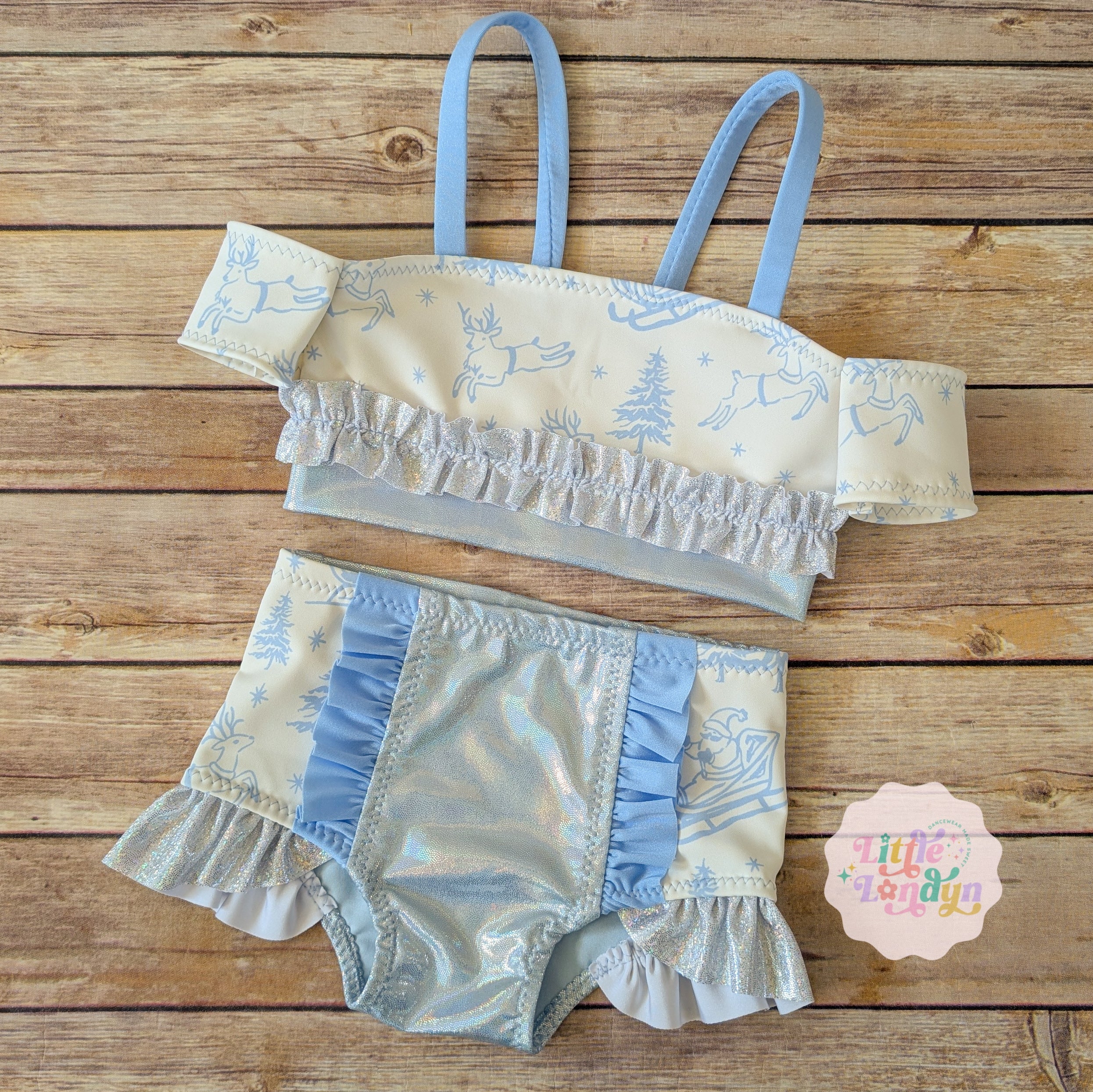 Cuffed crop style top with ruffle front low waisted bottoms.